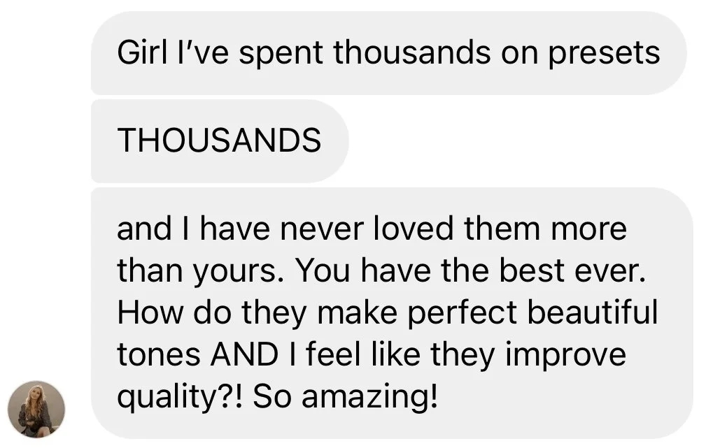 If you’re looking for consistency in your editing, presets can be incredibly valuable to have in your toolkit as a photographer. With presets, you can create a signature look for your photos and give your clients reassurance that they will receive the high-quality pictures they are expecting. By using presets, you can streamline your editing process and save time, allowing you to deliver galleries more efficiently. And seriously, who couldn’t use more time in their day!?